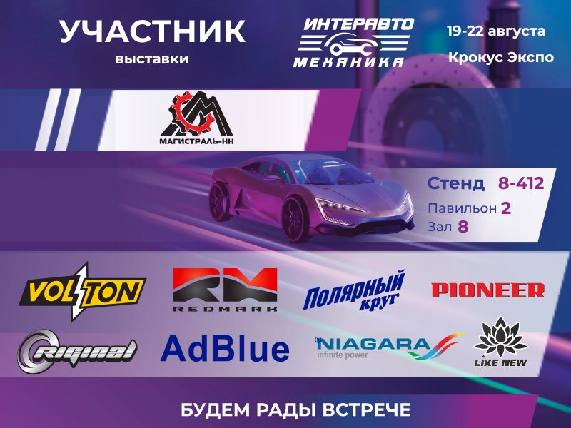 С 19 по 22 августа в Крокус Экспо посетители стенда компании Магистраль-НН (стенд № 8-412, павильон 2, зал 8) не только познакомятся с продукцией и услугами, зададут интересующие вопросы, но и получат возможность расширить свои деловые связи и узнать о новинках в мире автомобильной химии и авто комплектующих.