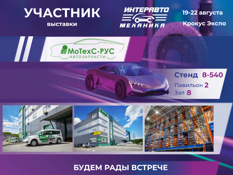 19–22 августа на выставке ИнтерАвтоМеханика в Крокус Экспо специалисты компании МоТехС-РУС (стенд № 8-540, зал 8, Павильон 2) профессионально проконсультируют по вопросу подбора необходимых запчастей, познакомят с ассортиментом компании, расскажут про спецпредложения, а также предложат оптимальные решения для бизнеса и заключения выгодных долгосрочных контрактов.